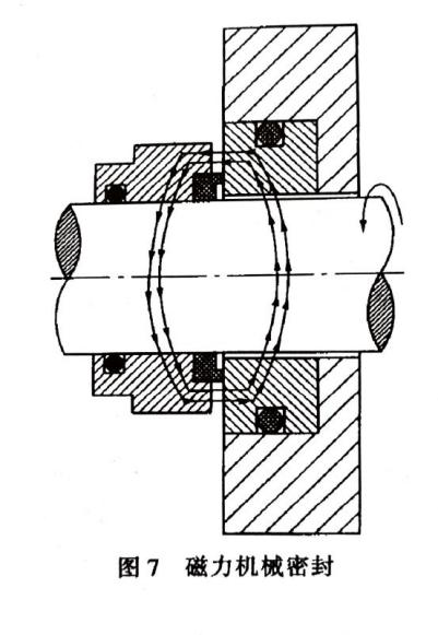 補償結(jié)構(gòu)的作用是使密封端面緊密貼合,為達到此目的,選用的辦法有兩種,一是彈性力,二是磁力。只有在系統(tǒng)內(nèi)壓力較低時采用磁力機械密封(圖7),大多數(shù)都用前者。除了用彈簧形成彈性力外還有用波紋管的,稱為波紋管式機械密封。波紋管的材質(zhì)可用橡膠、聚四氟乙烯(圖8a)和焊接的金屬薄片等(圖8b)。