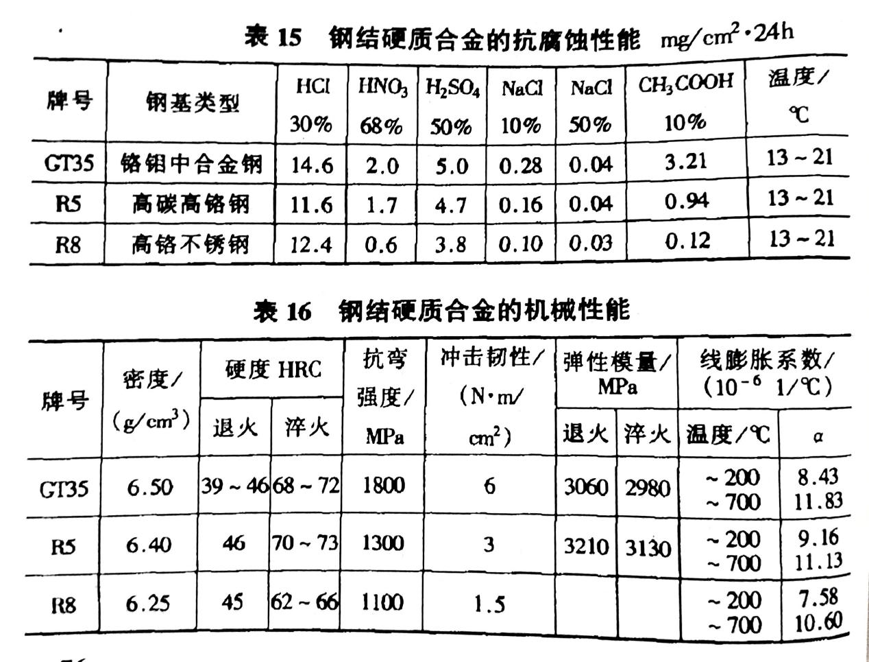 鋼結硬質合金的耐腐蝕性能隨鋼基的類型不同而異。它們在海水和堿液中的耐蝕性較好,在其他介質中的耐蝕情況和機械性能見表 15、16。
