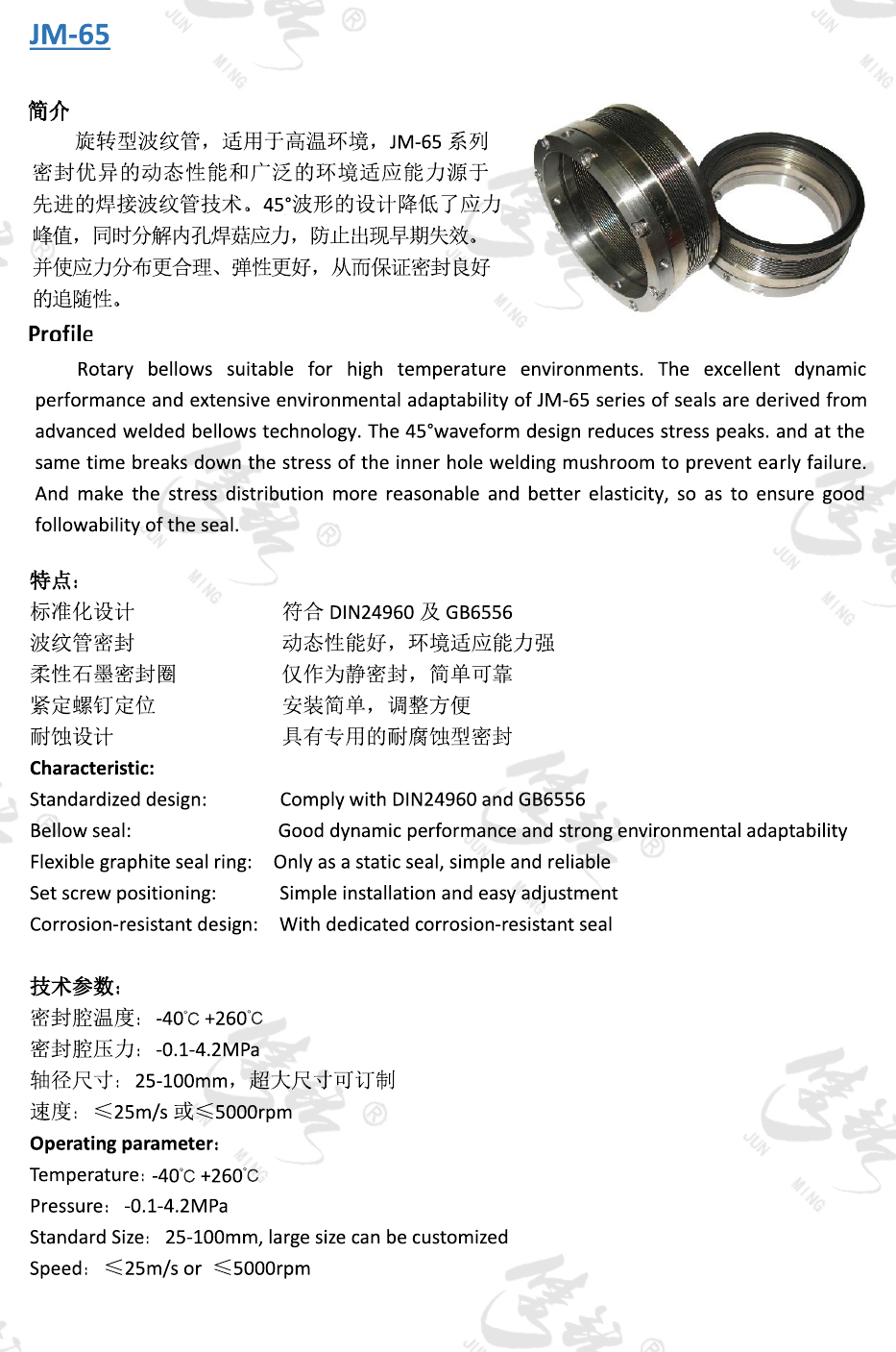 旋轉(zhuǎn)型波紋管,適用于高溫環(huán)境,JM-65系列密封優(yōu)異的動態(tài)性能和廣泛的環(huán)境適應(yīng)能力源于先進(jìn)的焊接波紋管技術(shù)。45°波形的設(shè)計(jì)降低了應(yīng)力峰值,同時分解內(nèi)孔焊菇應(yīng)力,防止出現(xiàn)早期失效。并使應(yīng)力分布更合理、彈性更好,從而保證密封良好的追隨性。