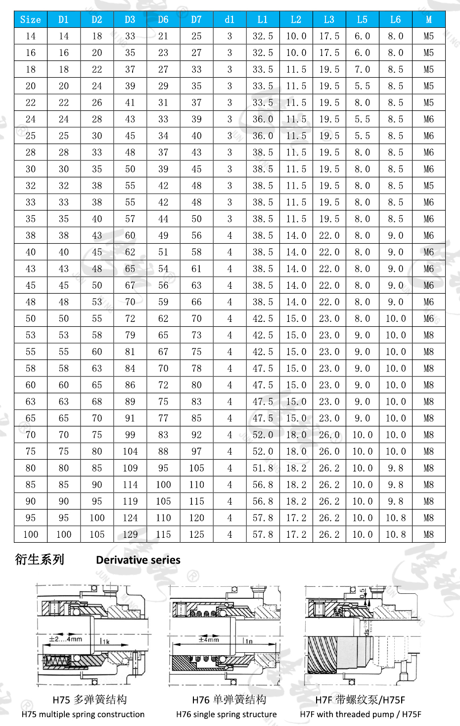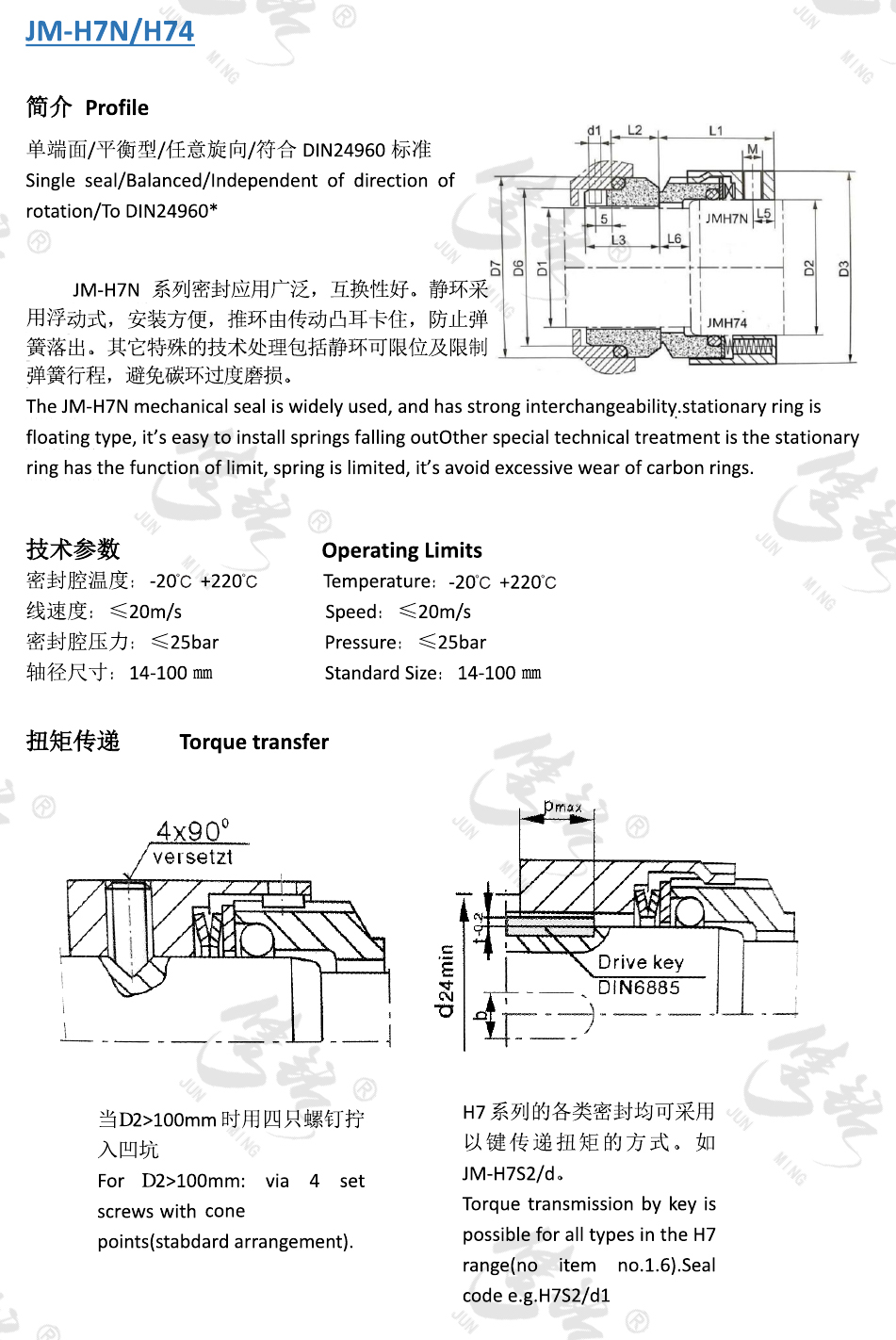 H7N系列密封應(yīng)用廣泛,互換性好。靜環(huán)采用浮動(dòng)式,安裝方便,推環(huán)由傳動(dòng)搭子卡住,防止彈簧落出。其它特殊的技術(shù)處理包括靜環(huán)可限位及限制彈簧行程,避免碳環(huán)過(guò)度磨損。