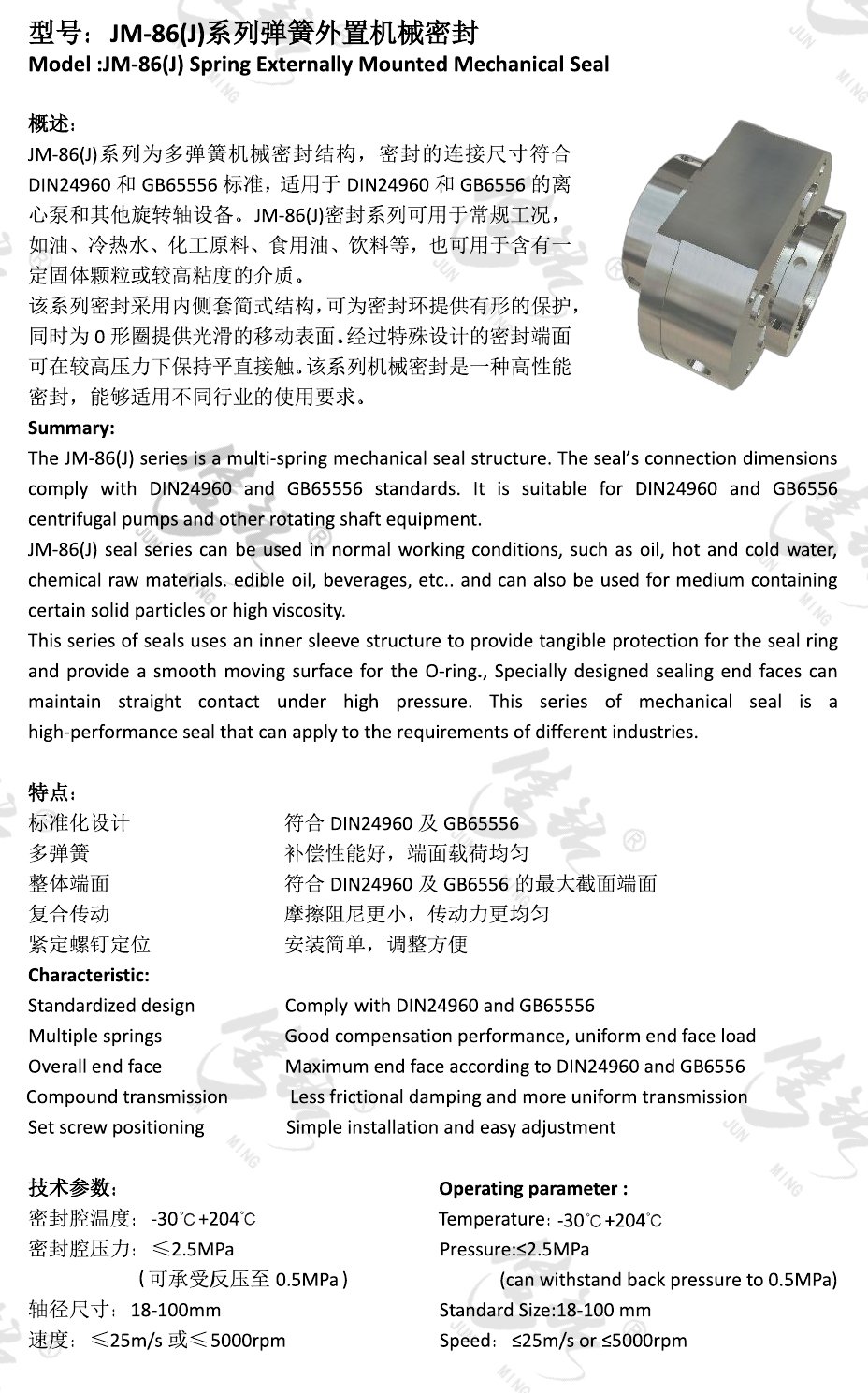 JM-86(J)系列為多彈簧機械密封結構,密封的連接尺寸符合DIN24960和GB65556標準,適用于DIN24960和GB6556的離心泵和其他旋轉軸設備。JM-86(J)密封系列可用于常規(guī)工況,如油、冷熱水、化工原料、食用油、飲料等,也可用于含有一定固體顆?;蜉^高粘度的介質。
