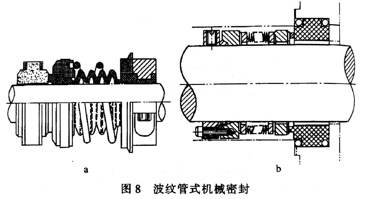 補(bǔ)償結(jié)構(gòu)為波紋管,其中一個(gè)密封環(huán)(動(dòng)環(huán)或靜環(huán))和波紋管制成一個(gè)完整體,其中不含有輔助密封圈(見圖8),所以減少了一個(gè)泄漏點(diǎn);同時(shí)減少了補(bǔ)償結(jié)構(gòu)的摩擦阻力,優(yōu)化了追隨性;對于焊接金屬波紋管密封(圖8b)運(yùn)行溫度不受輔助密封圈的影響限制;對于四氟波紋管密封(圖8a)可用于腐蝕性介質(zhì)中。其缺點(diǎn)是有的波紋管彈力較小,需要額外附加彈簧進(jìn)行輔助補(bǔ)償,如(圖8a)所示。