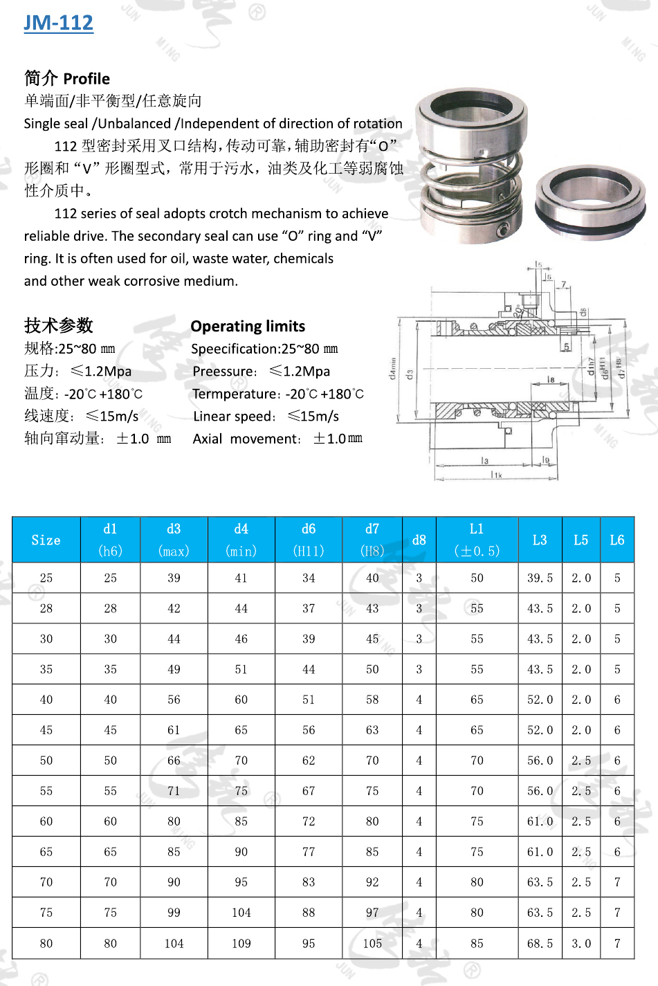 112型密封采用叉口結(jié)構(gòu),傳動可靠,輔助密封有“O”形圈和“V”形圈型式,常用于污水,油類及化工等弱腐蝕性介質(zhì)中。